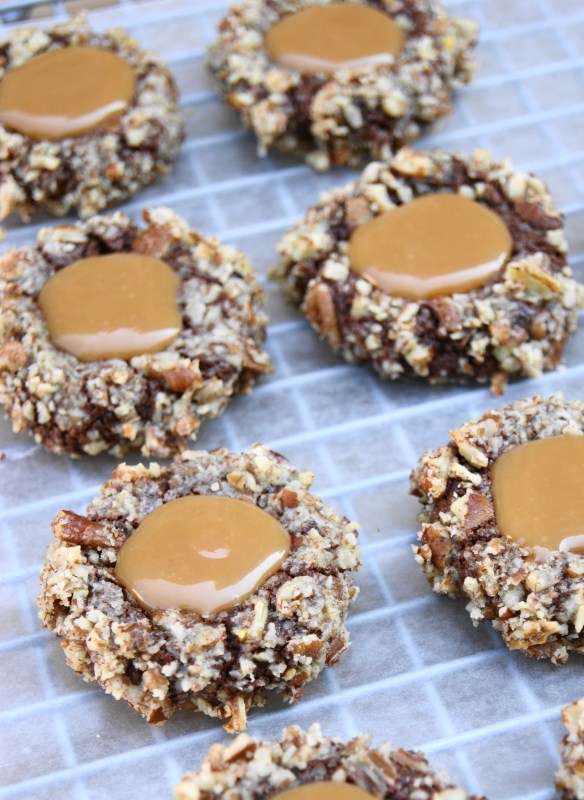- Once cookies are removed from the oven, gently re-press the indentations. Fill each indentation with about 1/2 teaspoon of the caramel mixture. Cool on the pan for 10 minutes, then transfer to a wire rack to cool completely.