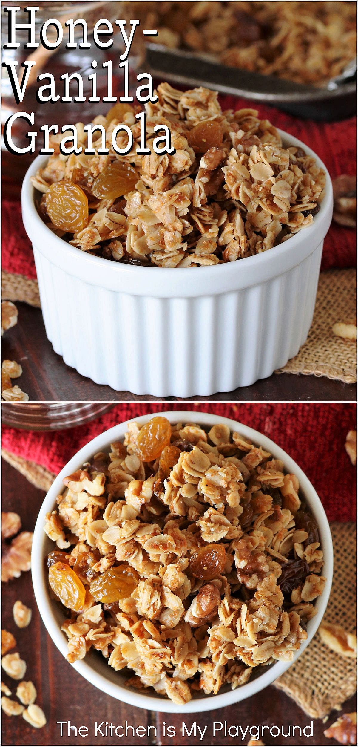 Homemade Honey-Vanilla Granola ~ A healthy & delicious snack that highlights the beautiful flavor of honey! Loaded with sunflower seeds, walnuts, golden raisins, vanilla extract, & pure honey, it's loaded with fabulous flavor, too.  www.thekitchenismyplayground.com